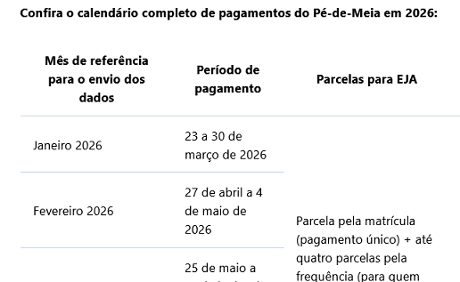 Confira o calendário completo de pagamentos do Pé-de-Meia em 2026: