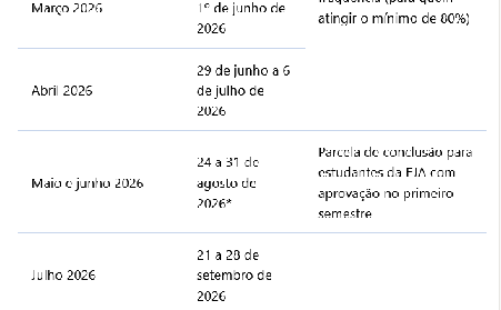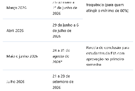 Até quatro parcelas de frequência (para quem atingir o mínimo de 80%) Agosto 2026 19 a 26 de outubro de 2026