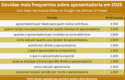 Segundo o estudo, as buscas pelo termo “aposentadoria” cresceram 84,91% em 2025, em comparação com 2024, ultrapassando 3 milhões de pesquisas anuais.
