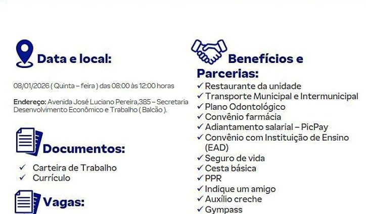 O secretário da Pasta, João Roberto Lameu, informou que as entrevistas que acontecerão nesta quinta-feira, dia 08, das 08h às 12h, no salão do Balcão de Empregos situado à Avenida José Luciano Pereira, 385 – Centro (ao lado da Caixa d’Água Central) visam o preenchimento das seguintes vagas: