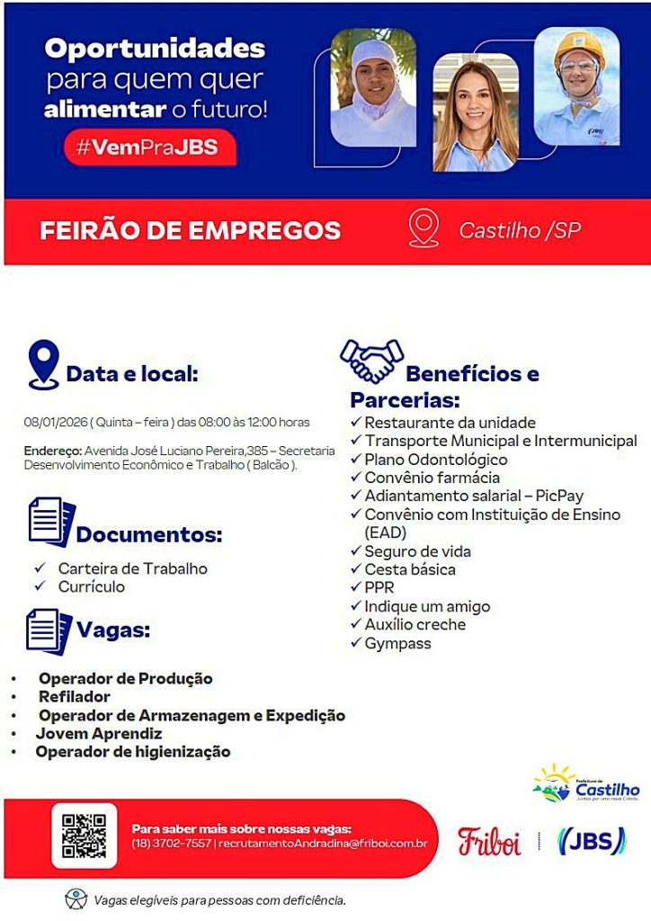 O Balcão de Emprego da Secretaria de Desenvolvimento Econômico e Trabalho da Prefeitura de Castilho anunciou a gigante JBS FRIBOI, de Andradina, será a primeira grande parceira do Município para abrir o ciclo de contratações de profissionais castilhenses para o mercado de trabalho.
