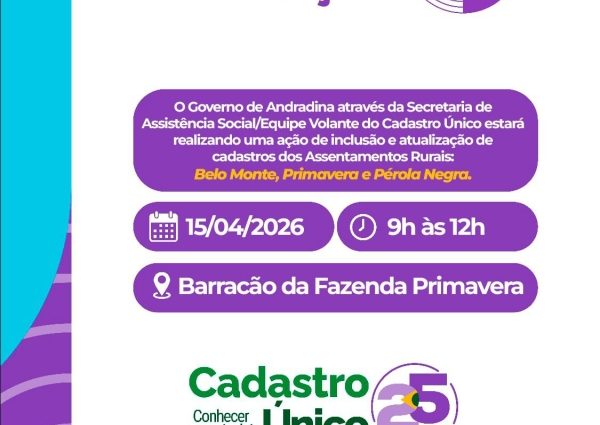 A Secretaria de Assistência Social de Andradina está promovendo um mutirão voltado para a inclusão e atualização do Cadastro Único na zona rural. O evento acontecerá amanhã, dia 15 de abril, no barracão da Fazenda Primavera, oferecendo uma oportunidade importante para os moradores da região.