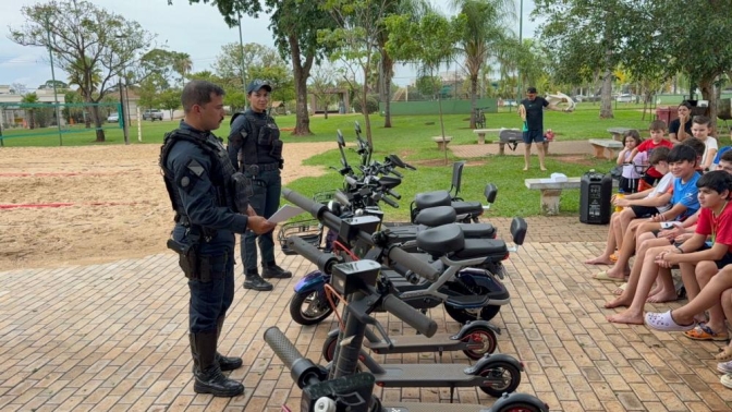 Três Lagoas – MS, no dia 15 de novembro, os policiais militares do 2º Batalhão de Polícia Militar realizaram palestra educativa sobre o uso seguro de bicicletas e patinetes elétricos, no condomínio Portal das Águas.